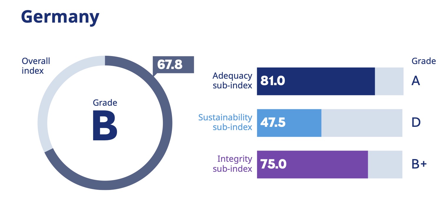 Deutschland konnte sich in der Gesamtbewertung mit 67,8 von 100 möglichen Punkten gegenüber dem Vorjahr (67,3) minimal verbessern, liegt aber mit dem 22. Platz (VJ 20) weiterhin im Mittelfeld. Wenngleich, wie die Studienautoren erläutern, das deutsche Rentensystem mit Rang 10 (VJ 9) in der Sub-Kategorie „Angemessenheit“ zur Spitzengruppe zählt, stellt unter anderem die langfristige Finanzierbarkeit des Systems die größte Herausforderung dar: Die Note „D“ in der diesbezüglichen Sub-Kategorie „Nachhaltigkeit“ weist auf Risiken und/oder Mängel in der Rentenversorgung hin. Hier belegt Deutschland nur Rang 37. In Sub-Kategorie „Integrität“ belegt man den 30. Rang. Regulierung, Governance und Kommunikation des deutschen Rentensystems werden als gut bewertet (75,0 Punkte).