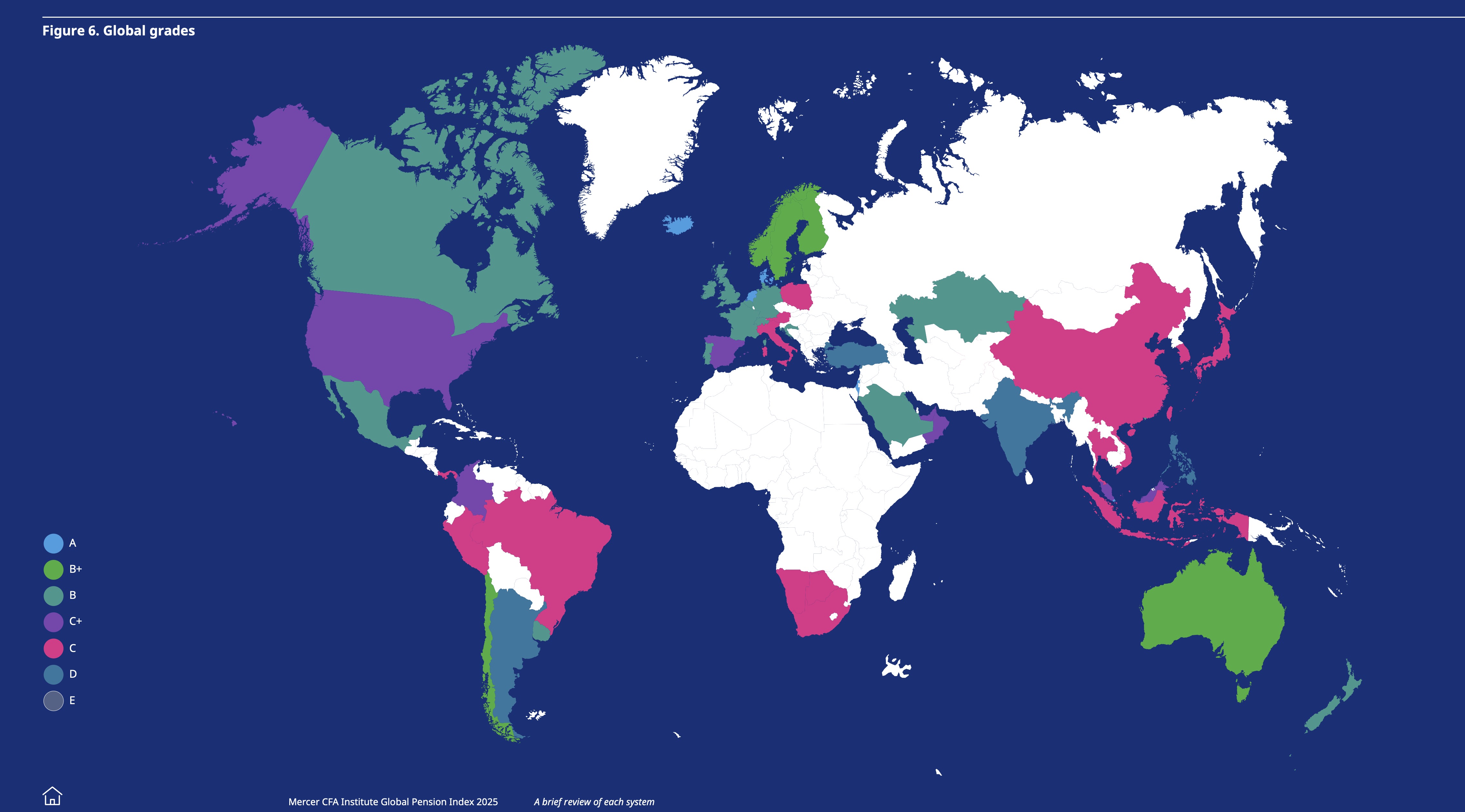 Der Mercer CFA Institute Global Pension Index 2025 vergleicht die Altersversorgungssysteme auf der halben Welt – und kann auf Seiten Mercers hier angefordert werden.