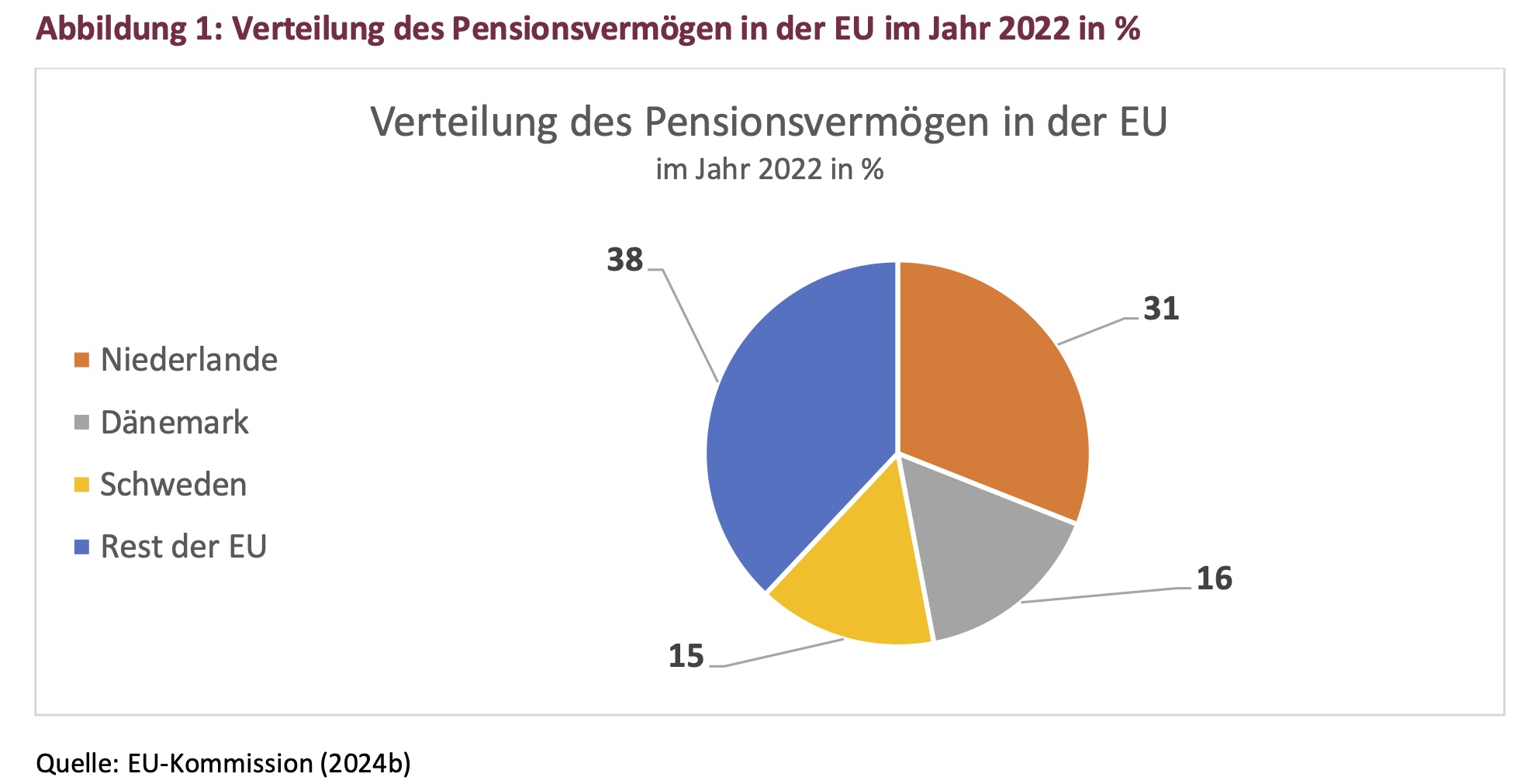 Weitere Zahlen aus dem cep-Report: Das Pensionsvermögen in der EU betrug 2022 immerhin 32% des BIP der EU. Dagegen können die USA und UK mit 142% bzw. 100% des BIP aufwarten. Und: Die EU-Deckungsmittel verteilen sich natürlich nicht gleichmäßig auf alle 27 Mitgliedstaaten, sondern konzentrieren sich zu 62% auf nur drei eher kleine Länder: