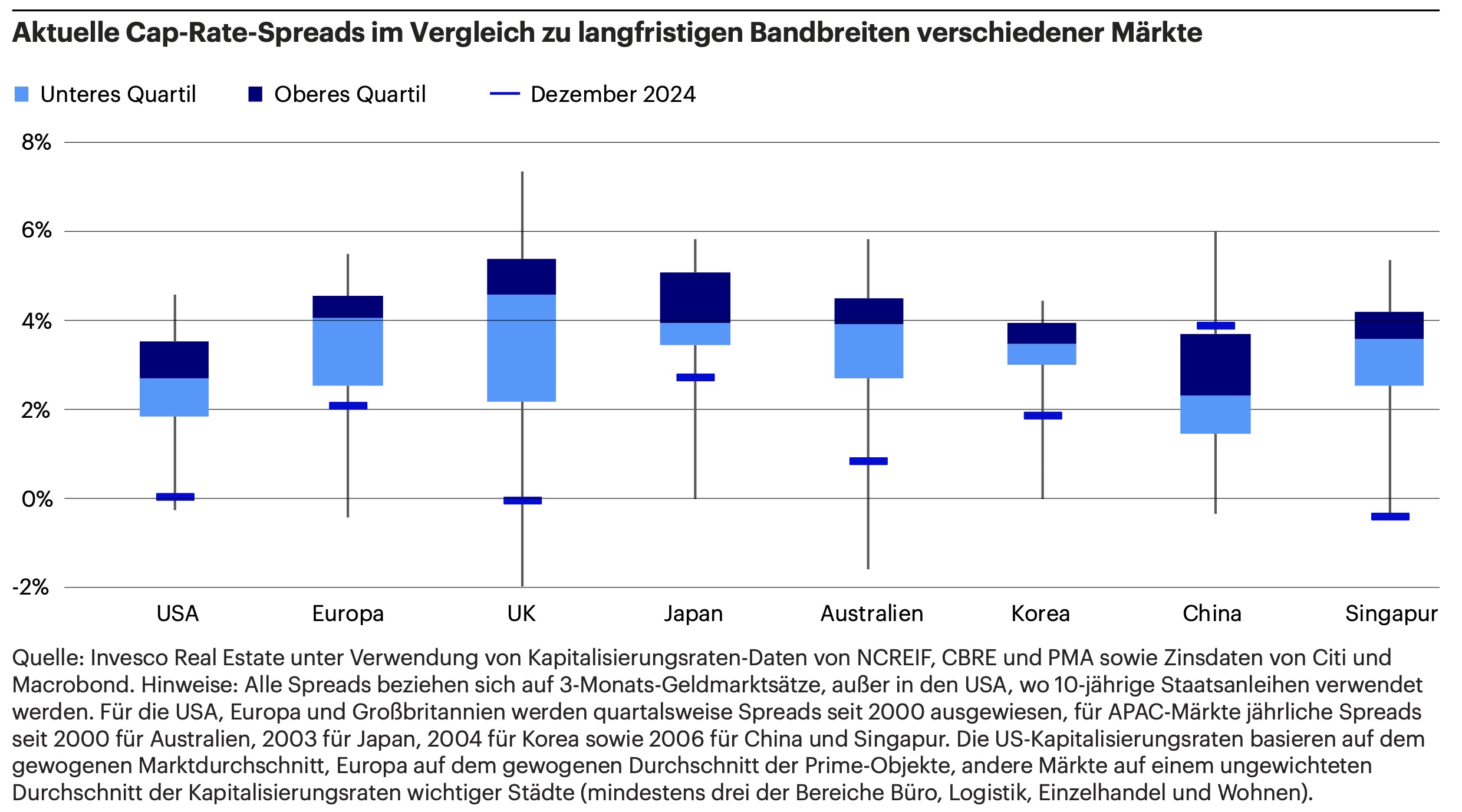 4.) Quelle: Invesco Real Estate unter Verwendung von Kapitalisierungsraten-Daten von NCREIF, CBRE und PMA sowie Zinsdaten von Citi und Macrobond.