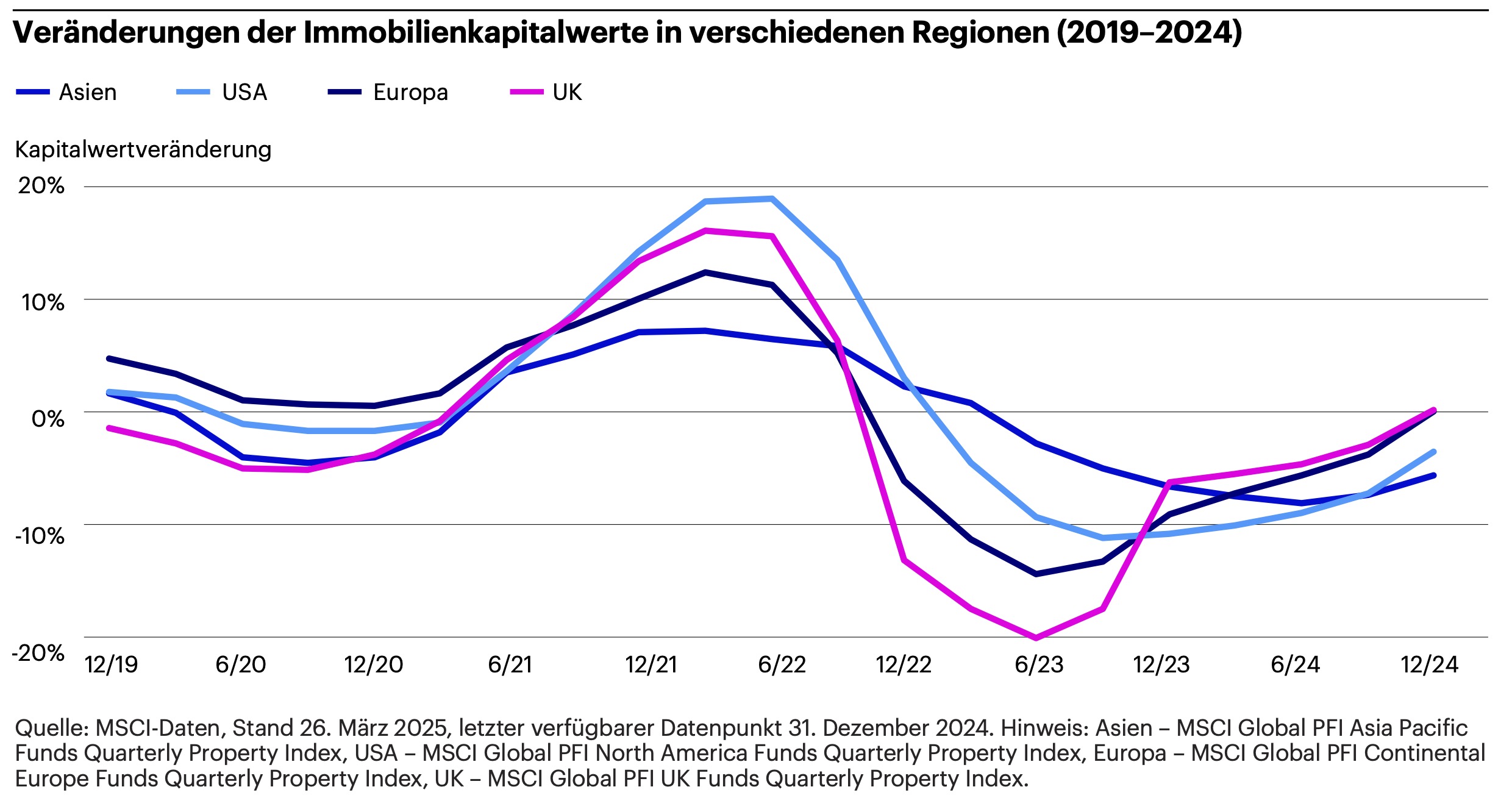 3.) Quellen: ANREV, INREV, NCREIF ‘Global Real Estate Fund Index Q4 2024’; MSCI, Stand: Mai 2025.
