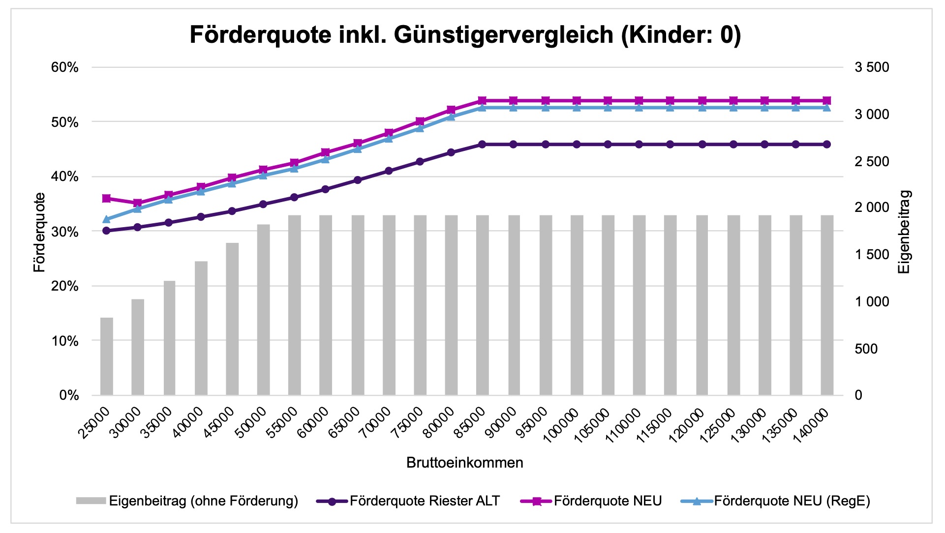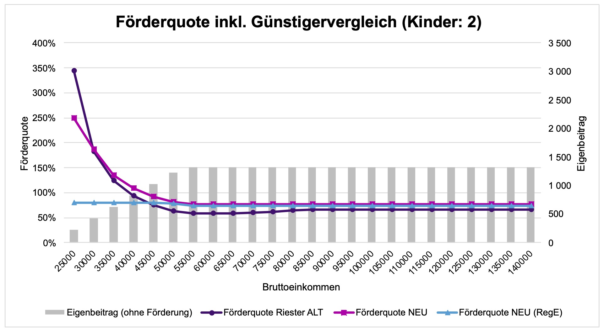 Insbesondere Einkommensbezieher bis 25.000 Euro bzw. mit geringen Eigenbeiträgen profitieren von der höheren Grundzulage. Für Familien mit Kindern fallen die Förderquoten bei unteren Einkommen zwar etwas geringer aus als beim alten Riester, liegen aber klar über dem, was der Regierungsentwurf ursprünglich vorgesehen hatte.