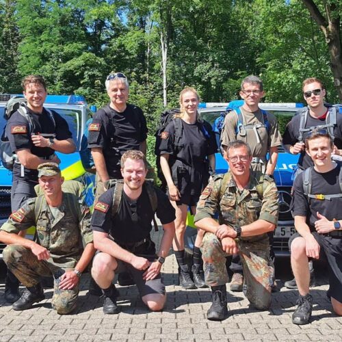 LEITERbAV hatte in seiner ersten Feuilleton-Ausgabe berichtet: Der Pensionsrechtler Christian v. Buddenbrock von Beiten Burkhardt hatte mit befreundeten Autobahnpolizisten einen Marathon-Marsch verabredet, also 42 Kilometer, dazu 13 Kilo Gepäck, zwei Mannschaften à 5 bzw. 6 Mann/Frau, also sieben Polizisten und fünf Soldaten/Reservisten der Deutschen Bundeswehr (der Chronist lief als Fotoberichterstatter außer Konkurrenz mit).