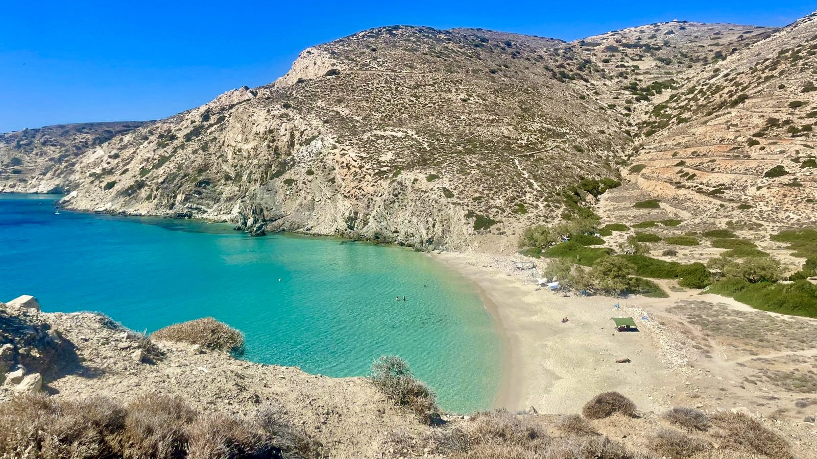 Donousa hat schöne Strände, die mal mehr oder weniger einfach oder schnell erreichbar sind. Die Wege sind markiert, zwischen fünfzehn Minuten bis zu knapp anderthalb Stunden können die Wanderungen vom Hauptort dauern. Regelmäßig pendelt ein kleiner Bus hin und her und entlässt Touristen an Strände mit wunderschön blau schimmernden Buchten. Zur perfekten Einstimmung gibt es auf jeder Fahrt griechische Musik über die Lautsprecher. Man möchte fast tanzen im Bus. Leer genug ist das Gefährt in der Nebensaison allemal. Auch ein kleiner Kutter bringt die Strandfreunde an Land und holt diese zuverlässig wieder ab. Manchmal kommt noch ein Schnorchelstopp in einer nahen Grotte dazu.