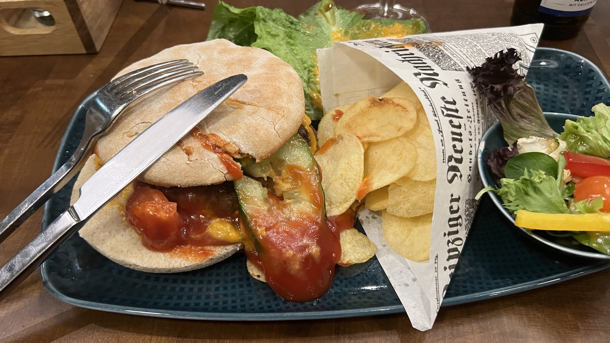 Alle sind erleichtert. Können sie noch ihren Enkeln von erzählen. Der Wanderer geht seines Weges Richtung Gate und nimmt kurz vor dem Boarding noch schnell einen – sehr mittelmäßigen – Burger zu sich. Der wird – obwohl IM Sicherheitsbereich des Flughafens, also HINTER der Schleuse, gelegen – standesgemäß serviert; zwar nicht mit Vorhängeschloss, dafür womit? Richtig: mit Messer und Gabel aus Stahl: