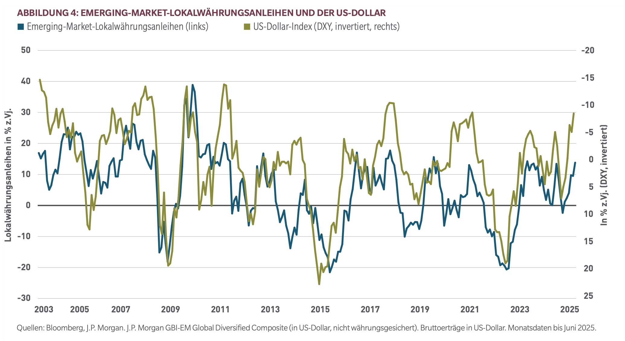 Angesichts der wachsenden Zweifel an der Ausnahmestellung der USA wird weltweite Diversifikation immer wichtiger. Emerging Market-Lokalwährungsanleihen könnten davon am stärksten profitieren, zumal der Dollar weiter abwerten könnte (Thema 4). Die Aussichten für Lokalwährungsanleihen sind also gut.