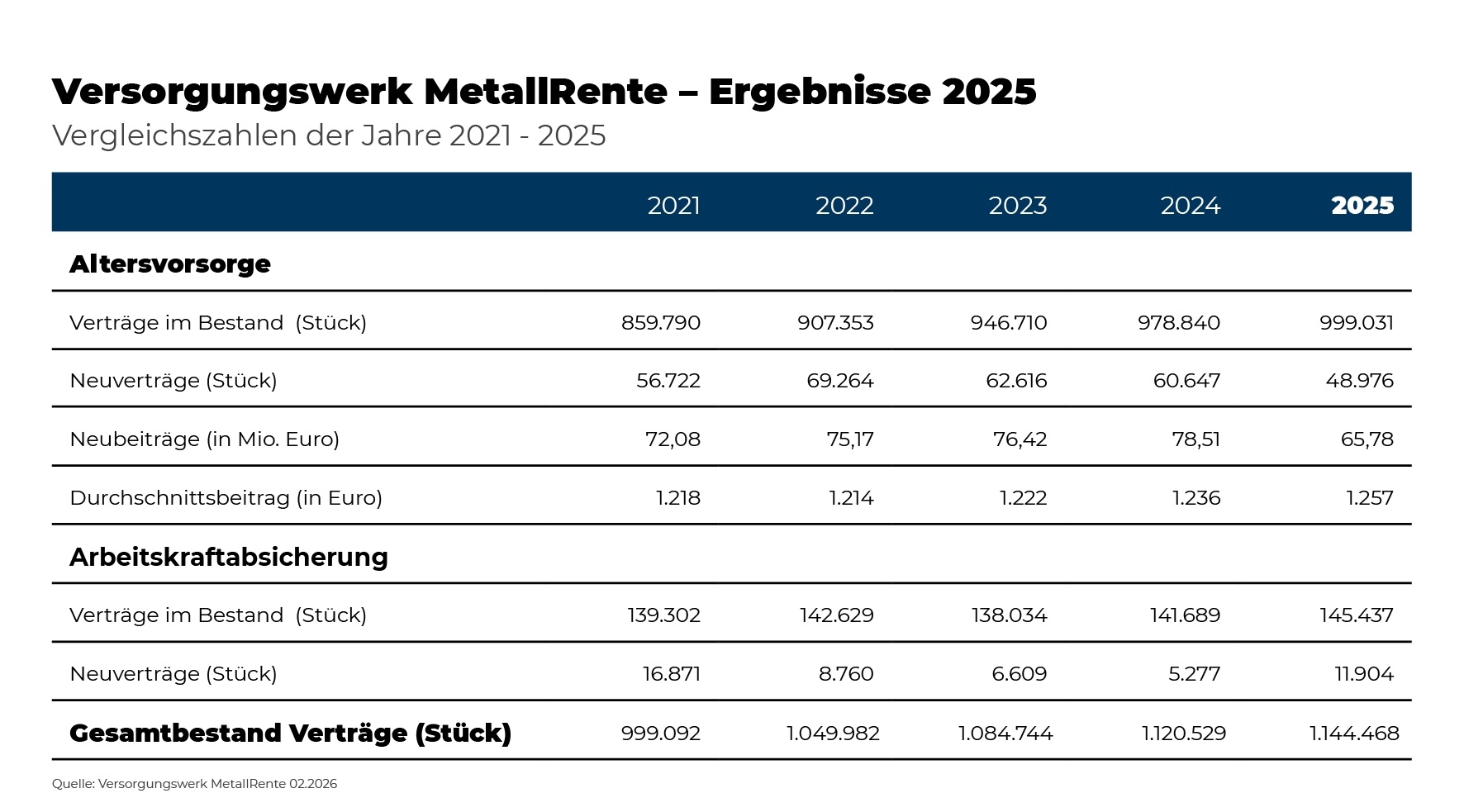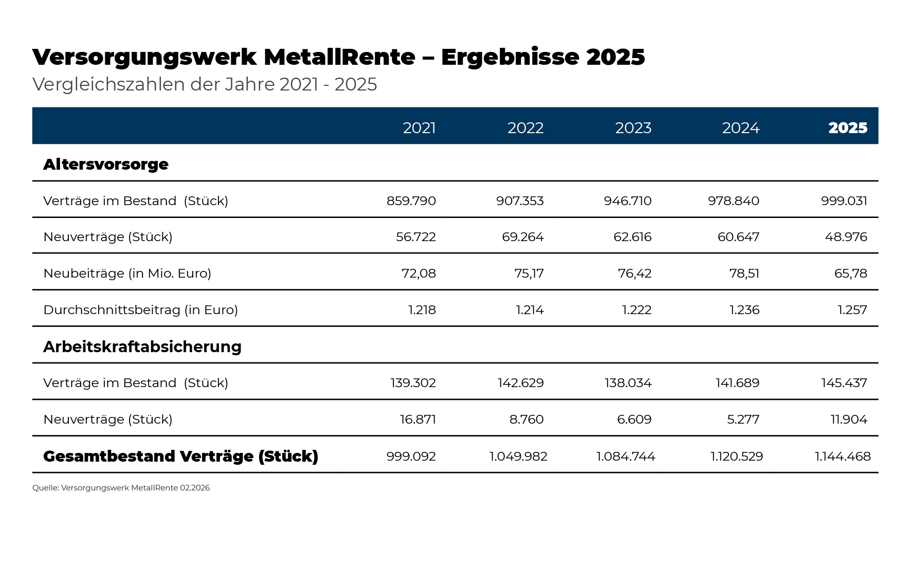 Zu den Details: Zu Beginn des 25. Jubiläumsjahres 2026 verzeichnet die 2001 gegr. MetallRente (neben der Metall- und Elektroindustrie auch die Stahlindustrie mit ihrem eigenen AG-Verband, außerdem Textil und Bekleidung, IT sowie Holz und Kunststoff angeschlossen; insg. > 50.000 Arbeitgeber) einen Gesamtbestand von 1,14 Mio. Verträgen.Quelle: Metallrente. Grafik zur Volldarstellung anklicken.