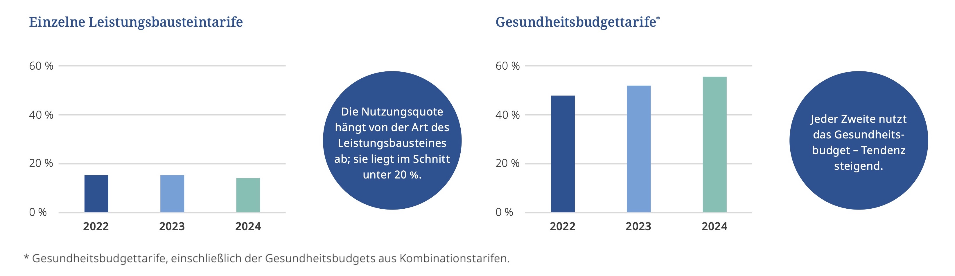 Laut Auswertung weisen die meisten einzelnen Leistungsbausteine – also traditionell die älteren, leistungsmäßig klar definierten Tarife – eine Nutzungsquote von unter 20% auf. Dennoch hätten diese ihre Daseinsberechtigung, da die Kostenbelastung im Fall eines Leistungsfalles höher ausfällt und sie die MA daher finanziell entlasten können. „Jeder zweite MA nutzt dagegen das Gesundheitsbudget – Tendenz steigend“, beobachtet Till:
