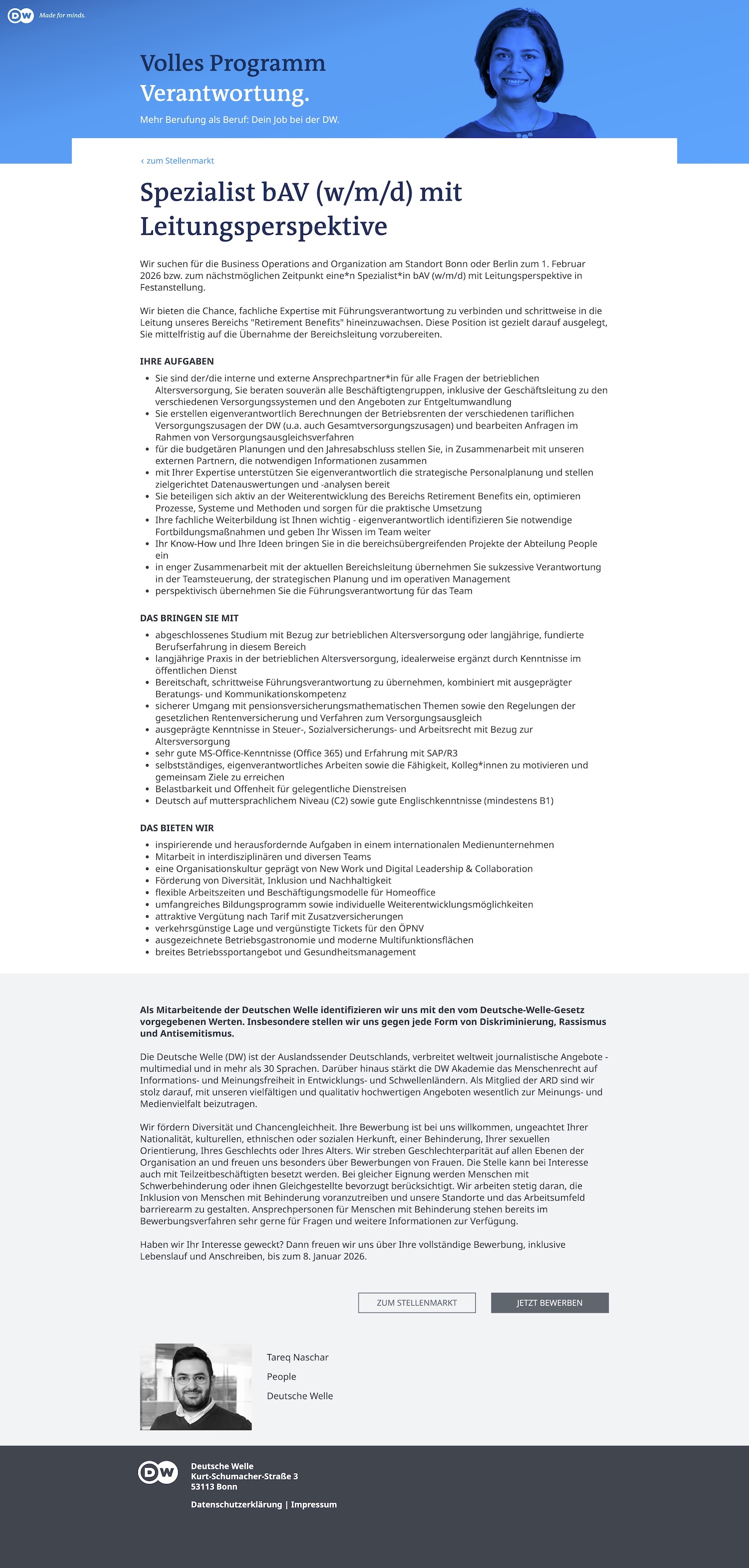 Wir bieten die Chance, fachliche Expertise mit Führungsverantwortung zu verbinden und schrittweise in die Leitung unseres Bereichs „Retirement Benefits“ hineinzuwachsen. Diese Position ist gezielt darauf ausgelegt, Sie mittelfristig auf die Übernahme der Bereichsleitung vorzubereiten.