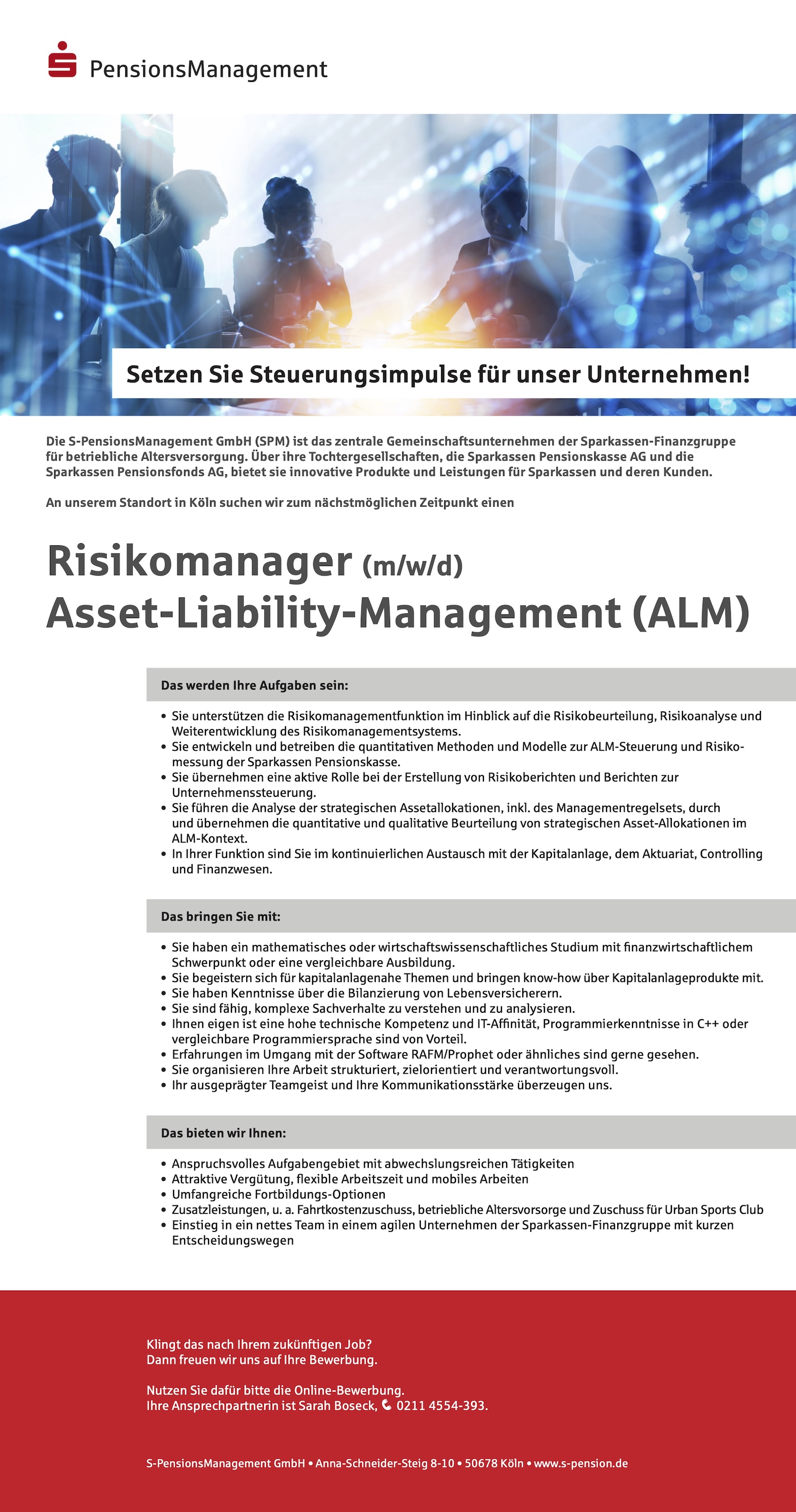 Die S-PensionsManagement GmbH (SPM) ist das zentrale Gemeinschaftsunternehmen der Sparkassen-Finanzgruppe für betriebliche Altersversorgung. Über ihre Tochtergesellschaften, die Sparkassen Pensionskasse AG und die Sparkassen Pensionsfonds AG, bietet sie innovative Produkte und Leistungen für Sparkassen und deren Kunden.