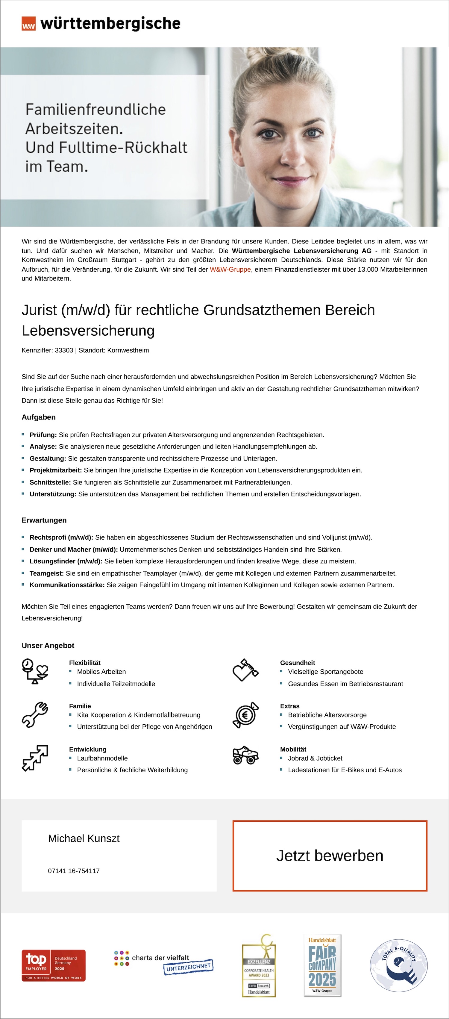 Wir sind die Württembergische, der verlässliche Fels in der Brandung für unsere Kunden. Diese Leitidee begleitet uns in allem, was wir tun. Und dafür suchen wir Menschen, Mitstreiter und Macher.