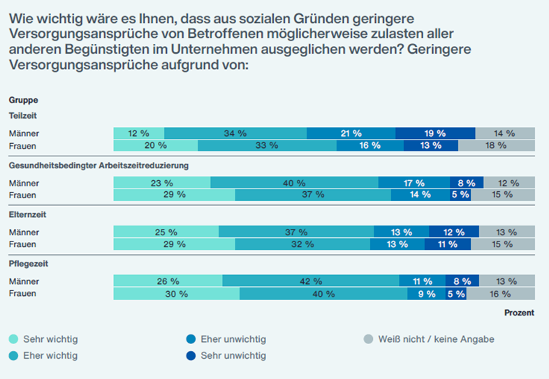 Der Gender Pension Gap, also der Versorgungsvorsprung von Männern gegenüber Frauen, bleibt ein zentrales Thema – auch, weil familiäre und gesundheitliche Auszeiten sich auf die Altersversorgung vieler Beschäftigter deutlich auswirken. Beschäftigte wünschen sich, dass diese Lebensphasen bei der Bemessung der Versorgungsleistungen berücksichtigt werden. Einen sozialen Ausgleich und faire Lösungen fänden rund die Hälfte bis zwei Drittel der Befragten wichtig – selbst dann, wenn dies zu Lasten aller geht. Bemerkenswert an diesem Ergebnis ist, dass die Befragten die Einschätzung unter dem klaren Hinweis auf eigene persönliche Nachteile durch den sozialen Ausgleich gegeben haben. Arbeitgeber dürfen somit auf eine große Akzeptanz für entsprechende Modelle setzen.