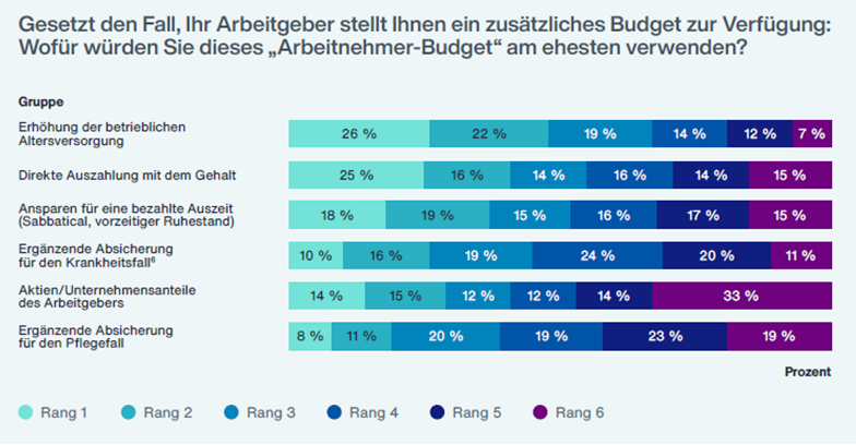 Die bAV hat sich zur zentralen Entgeltkomponente entwickelt: Für die große Mehrheit der Beschäftigten steht sie auf einer Stufe mit Gehalt und anderen Benefits. Besonders deutlich ist das (angegebene) Investitionsverhalten bei der Verwendung von Zusatzbudgets: Knapp 48% der Befragten würden ein zusätzliches Arbeitgeberbudget bevorzugt in die bAV stecken; erst danach folgt die Option der Barauszahlung (41%). Programme zur Mitarbeiterbeteiligung oder Aktienoptionen werden weniger stark gewählt.
